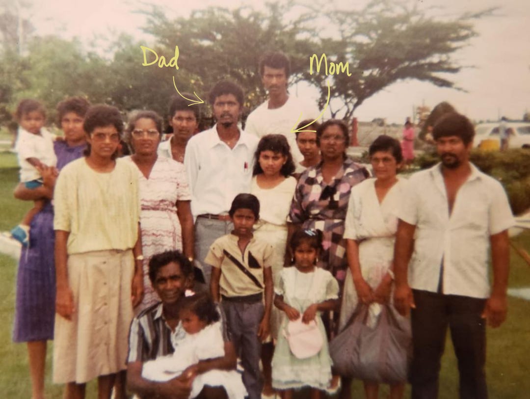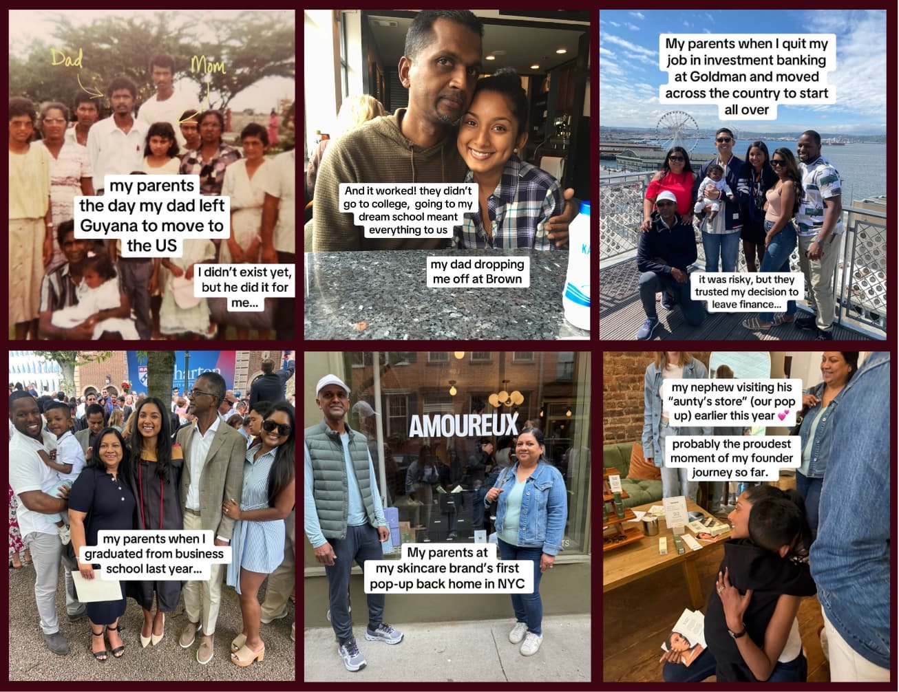 Shortly after, I posted something simple on TikTok. A carousel with photos of moments my parents showed up for me: the day my dad left Guyana, dropping me off at Brown, visiting me when I moved across the country after quitting my investment banking job, and a photo of them at my West Village pop-up earlier this year.